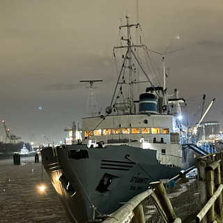 I learned that the title is a reference to “permanently shadowed craters” (Krater der ewigen Dunkelheit), which are regions on the Moon that remain in darkness at all times. So it felt almost magical to reflect that, on the MS Stubnitz, we were surrounded by the Elbe’s tidal waters, where the Moon’s influence becomes directly perceptible: On January 15, the Moon was in a waning crescent phase (the full Moon had been on January 3, with the new Moon only four days ahead), meaning the Sun and Moon were not fully aligned and the tidal forces were forecast to be moderate to weak. The tide shifts approximately every six hours from low to high, and at 7:30 pm (the event’s entry time), the tide was falling towars low. Low tide was at around 9 pm, and this was when I experienced an almost eerie stillness, when suddenly the water and ice no longer moved at all. A boat passed by in silence (movie below).